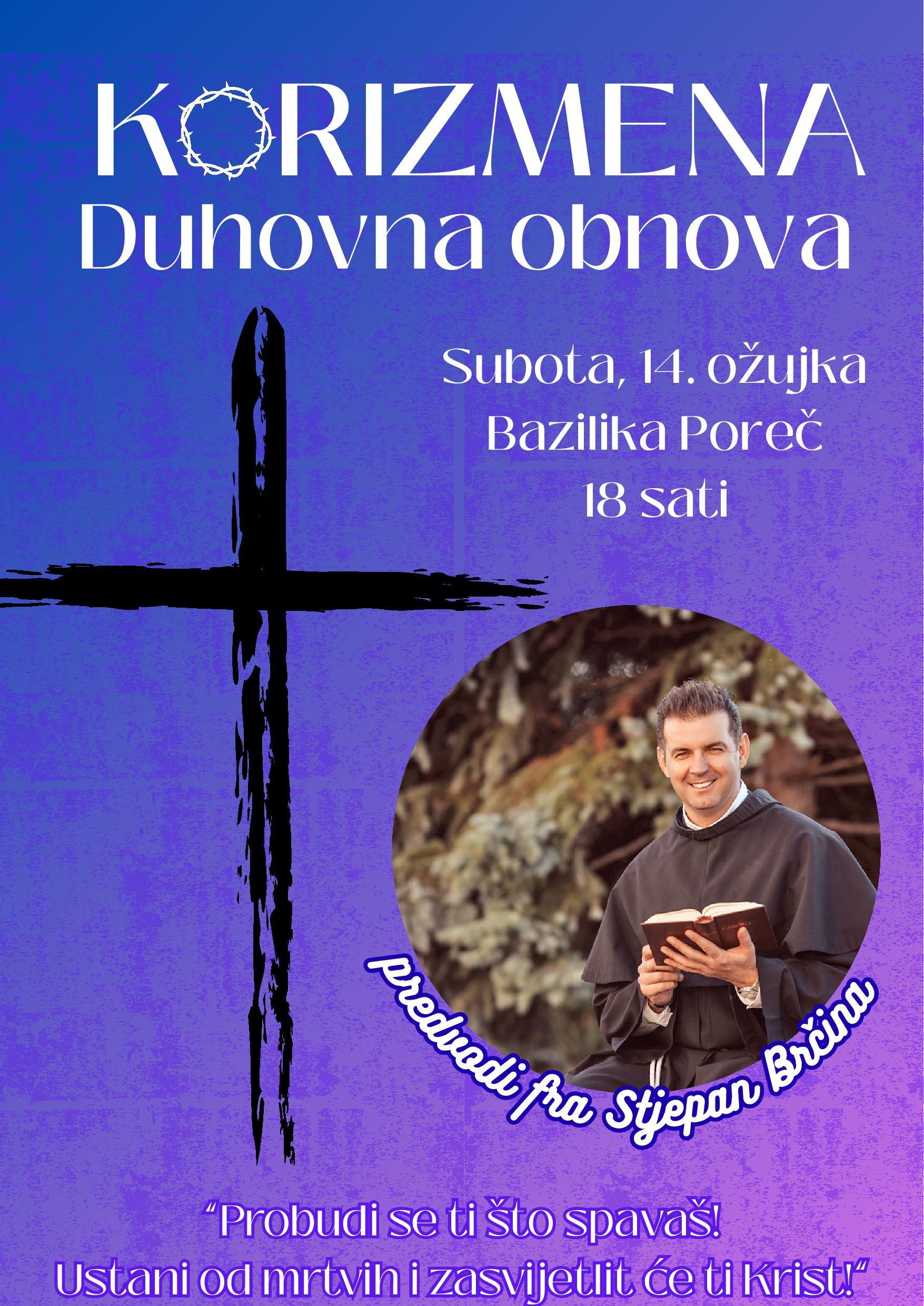 Korizmenu duhovnu obnovu u našoj porečkoj bazilici predvodit će fra Stjepan Brčina, franjevac konventualac. Korizmena duhovna obnova je organizirana 14. ožujka 2026. u 18 sati. Dobrodošli!