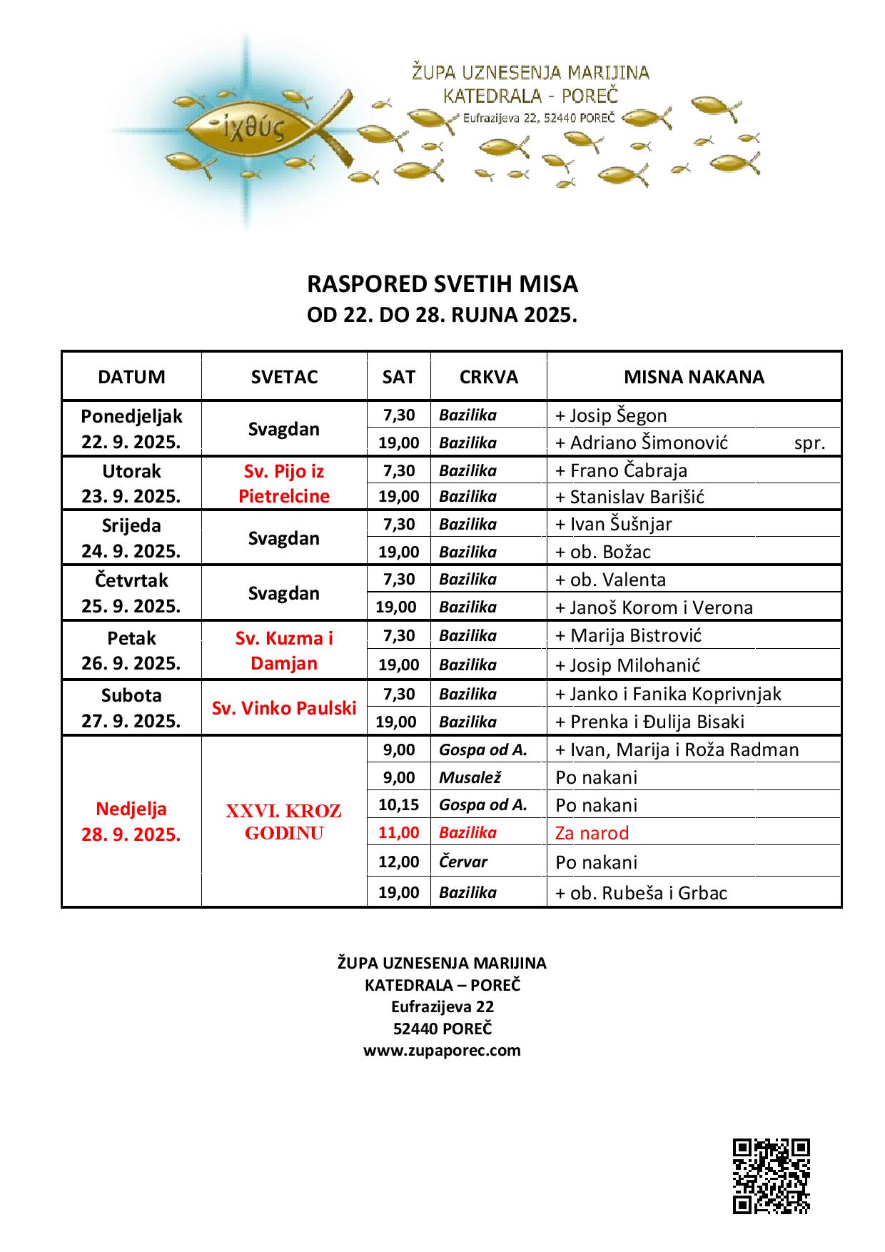 Raspored svetih misa od 22. do 28. rujna