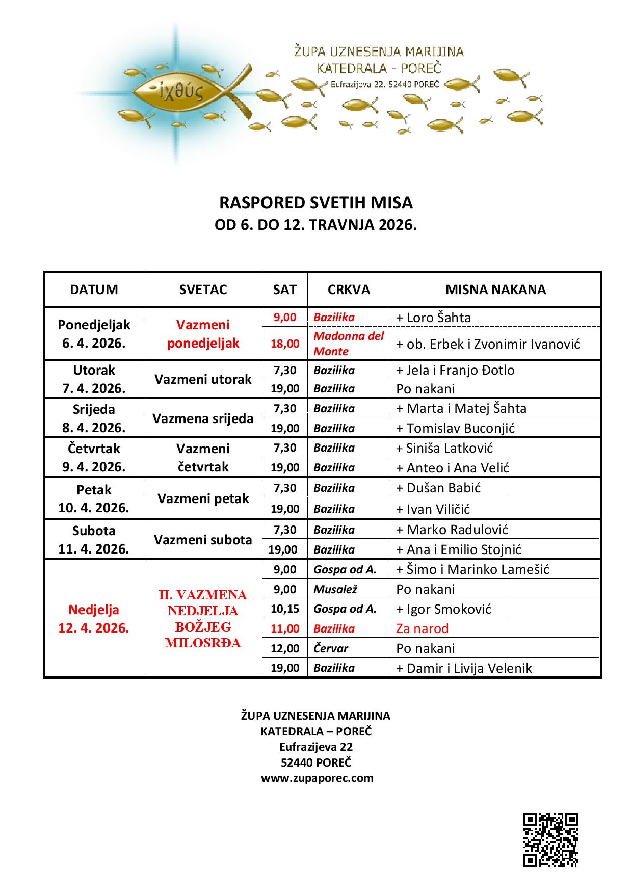 Raspored svetih misa od 6. do 12. travnja