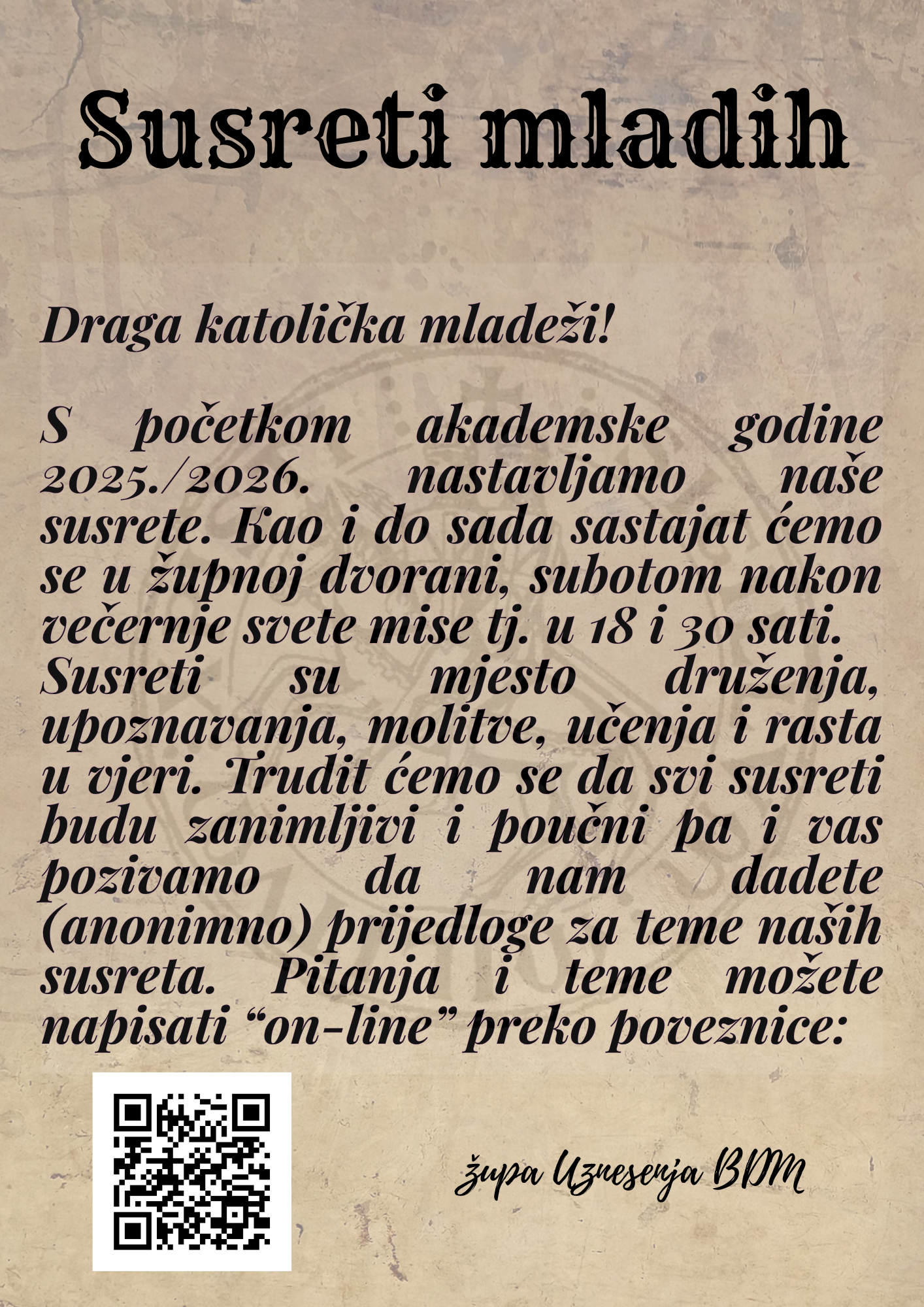 S početkom akademske godine 2025./2026. nastavljamo naše susrete. Kao i do sada sastat ćemo se u župnoj dvorani, subotom nakon večernje svete mise tj. u 18 i 30 sati. Susreti su mjesto druženja, upoznavanja, molitve, učenja i rasta u vjeri. Trudit ćemo se da svi susreti budu zanimljivi i poučni pa i vas pozivamo da nam dadete (anonimno) prijedloge za teme naših susreta. Pitanja i teme možete napisati “on-line” preko poveznice: